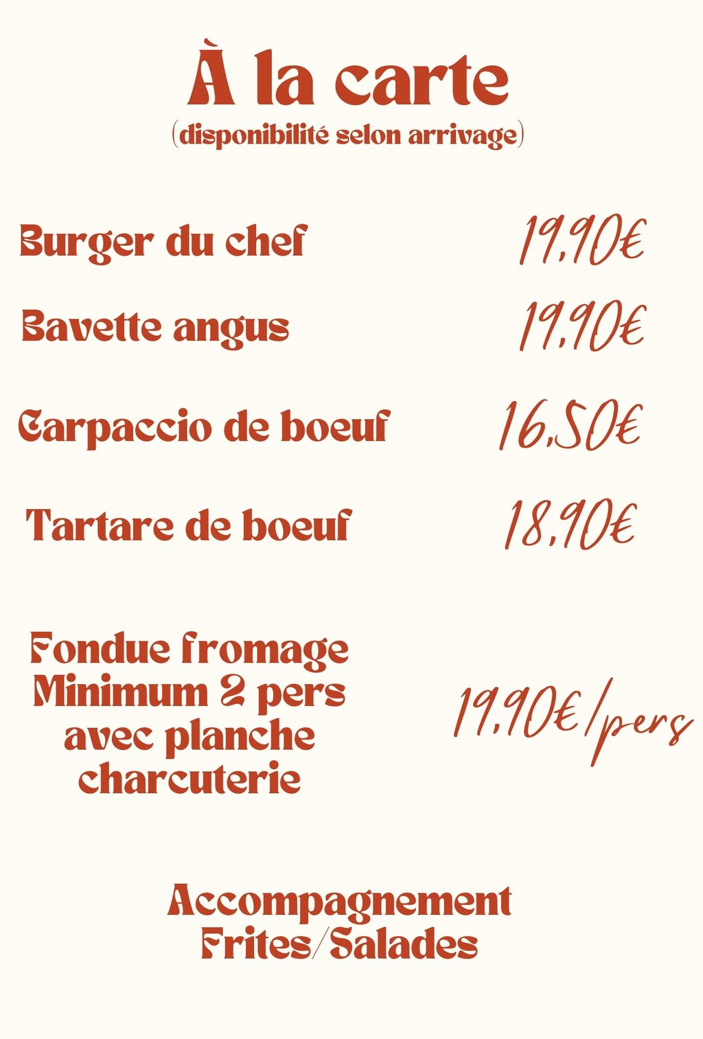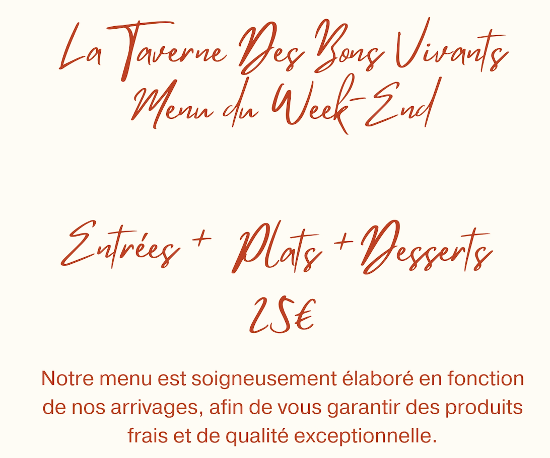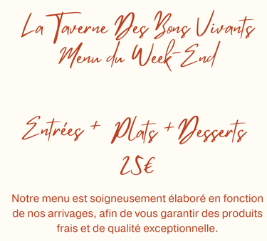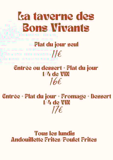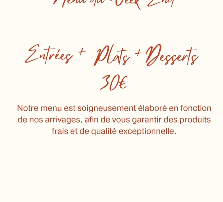 Menu du jour selon l'inspiration du chef, préparé avec des ingrédients frais et de saison. Chaque jour, découvrez des saveurs uniques et des créations gourmandes à ne pas manquer !