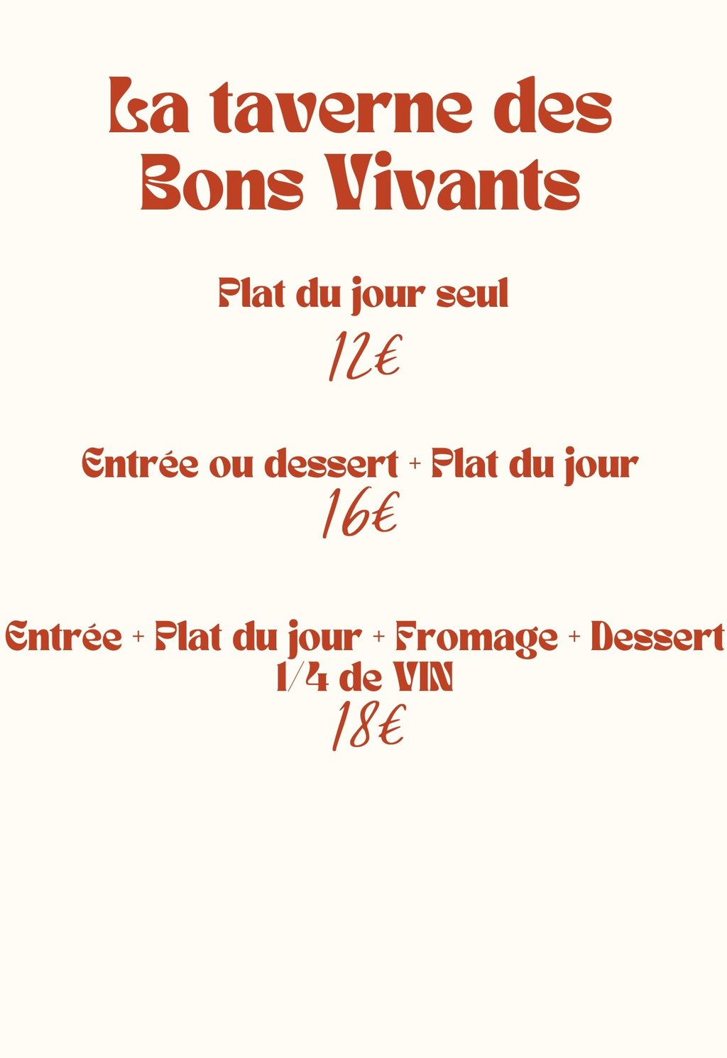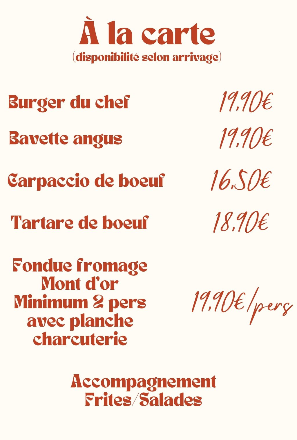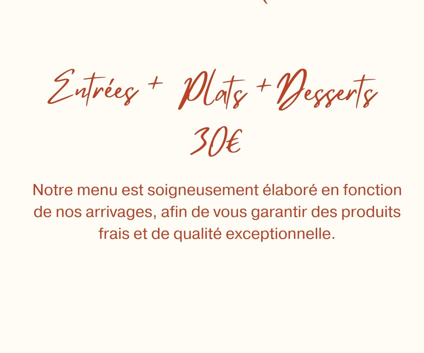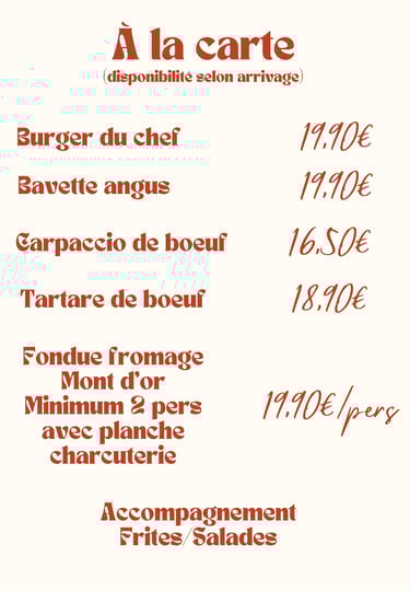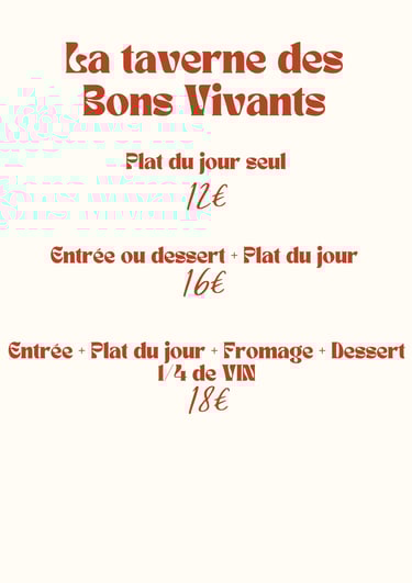 Menu du jour selon l'inspiration du chef, préparé avec des ingrédients frais et de saison. Chaque jour, découvrez des saveurs uniques et des créations gourmandes à ne pas manquer !
